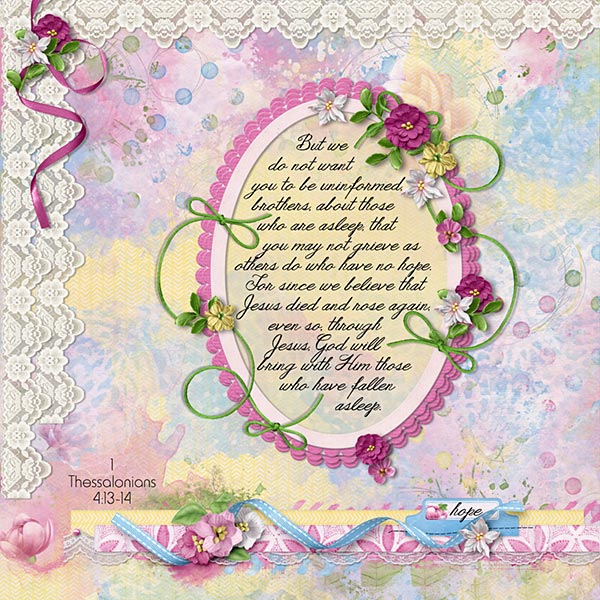 cluster border and artsy papers: Magnolious; lace: Days Gone By; ribbon: Kristmess Village; additional flowers, leaves, strings: May Daze - all by Kristmess Designs